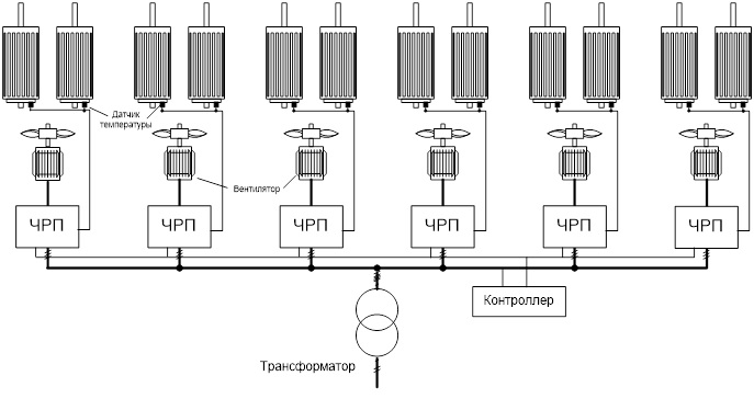 Применены ЧРП, мощностью по 45 кВт фирмы ХХХ, с датчиками температуры, которые по две шт. соединены с преобразователем. В контроллере по протоколу с ЧРП отображаются и архи-вируются аналоговые сигналы 4-20 мА с датчиков температуры. Управление частотой вращения вентиляторами производится через селективно выбранные автоматы и контакторы с контроллера в результате анализа 12 сигналов, где выбираются показания датчика с наибольшей температурой. Предусмотрена схема резервирования работы вентиляторов через выключатели нагрузок непо-средственно от сети, а также учтены входные и выходные цифровые сигналы управления для совместной работы с АСУ электровоза. .